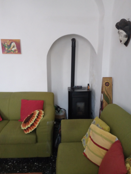 Im Anschluss gibt es ein Wohnzimmer mit Pelletofen und Zugang zum Balkon, welcher einen offenen und unverbaubaren Blick ins Grüne bietet und bis Boscomare.